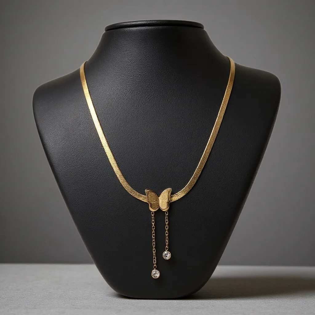 Let your style soar with The Butterfly Kisses Necklace. This stunning piece features a sleek gold herringbone chain adorned with a central butterfly charm and two dangling chains finished with sparkling crystals.