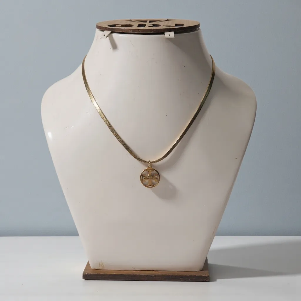 Make a statement with The Iconic Love Necklace. This stunning piece features a silky, flat gold herringbone chain that shines beautifully in the light, holding a modern circular geometric pendant.
