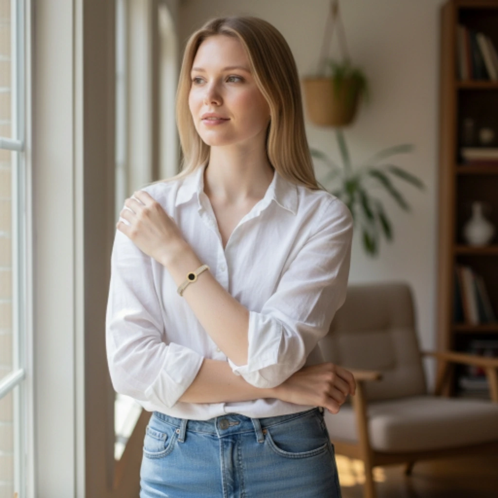 Closure: Secure oval-shaped hinge cuff for a comfortable fit on all wrist sizes.
